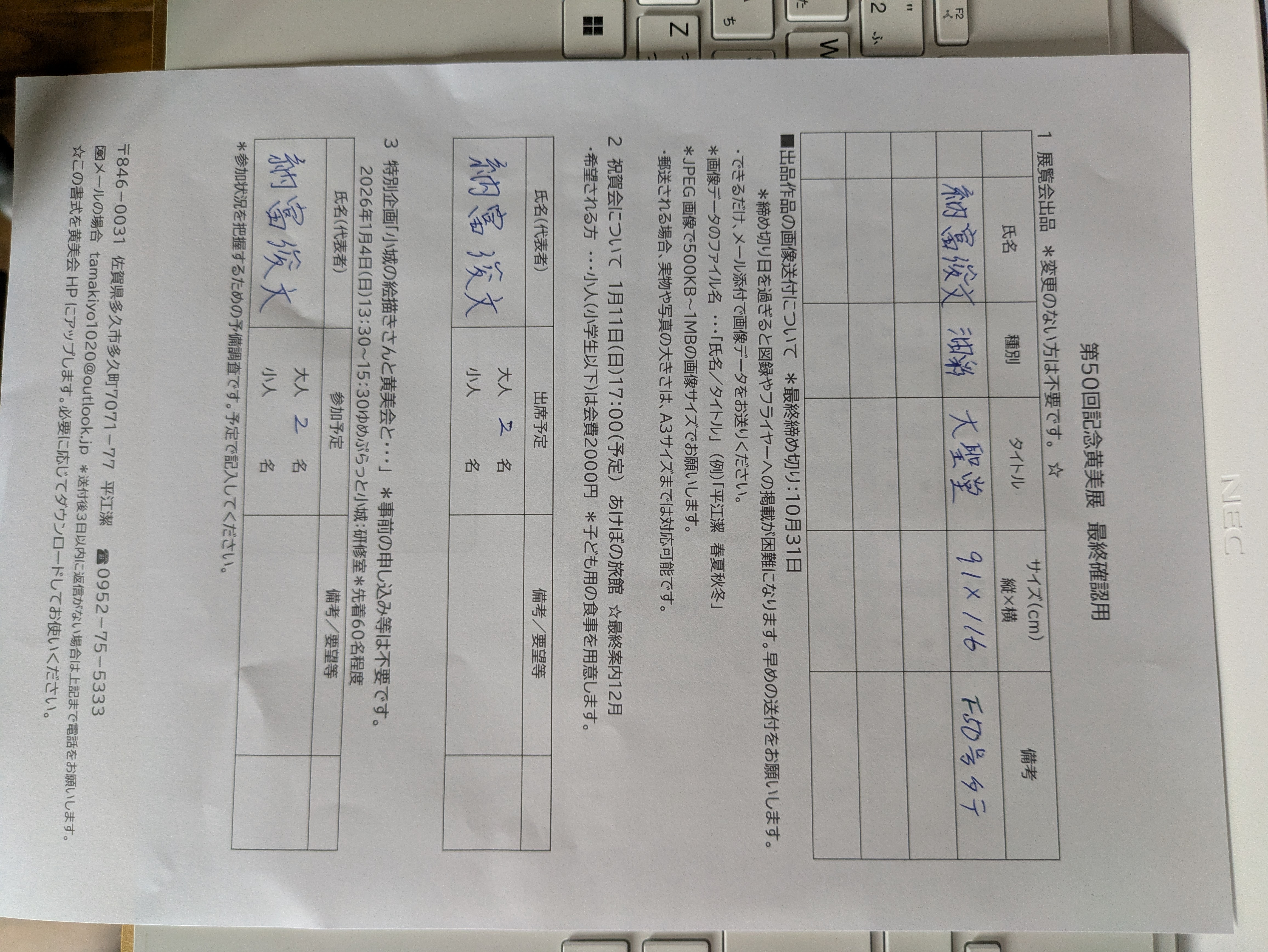 というよりは、平江君への連絡事項です。本日、LINEメールでで50周年黄美展の三次案内と最終確認書を添付して、12名の会員の皆さんへお知らせしました。