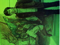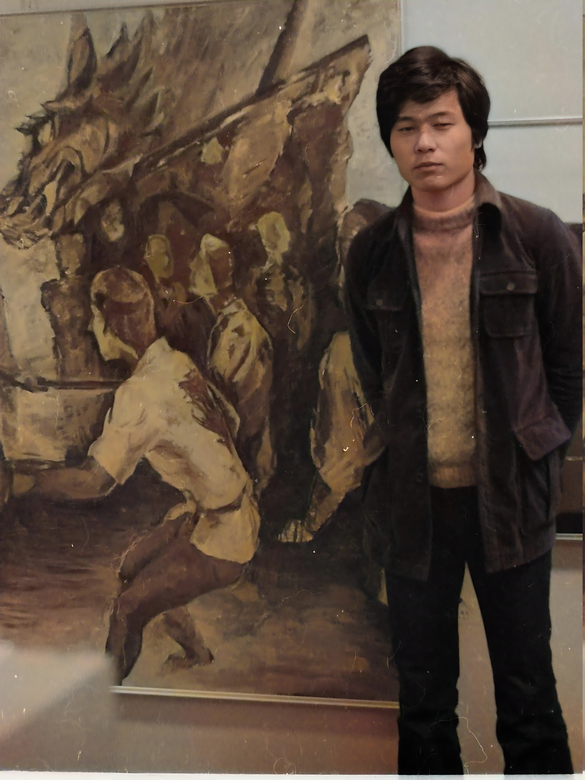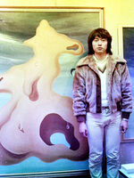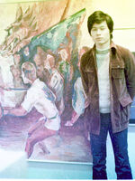 昔の黄美会の情報というわけではないのですが、第一回の黄美展(三彩画廊?)で、作品前に立つ、平江君と私のネガフィルムを見つけました。フィルムが焼けているので色が出ていませんが、データ落とししたので、お互い若い頃を笑ってやってください。